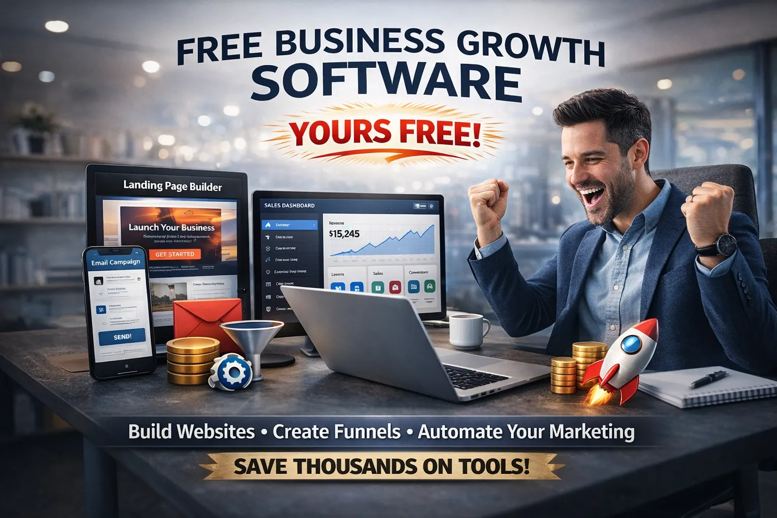 Apply today and receive FREE access to a premium all-in-one business platform that helps you build websites, sales funnels, email campaigns, and automate your marketing — saving you thousands each year. Delivered straight to your inbox after you apply.
